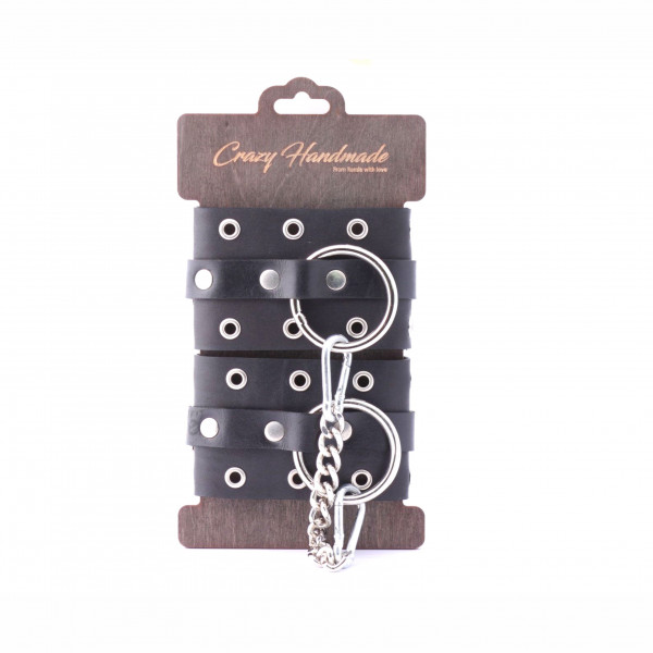 Выполнены оковы из натуральной кожи в черном цвете и декорированы люверсами и металлическими клепками